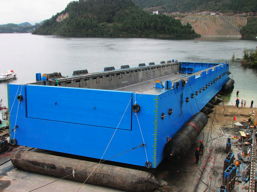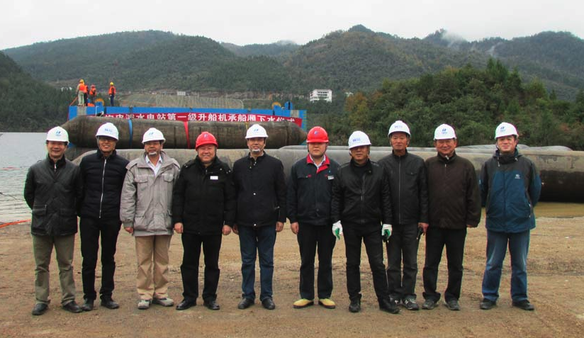 構(gòu)皮灘一級(jí)升船機(jī)承船廂構(gòu)皮灘通航工程是當(dāng)今世界通航水頭最高、單級(jí)提升高度最大、主提升設(shè)備規(guī)模最大的通航建筑物。為此公司董事長徐學(xué)明親自掛帥,在公司領(lǐng)導(dǎo)和相關(guān)部門的大力支持下,克服了現(xiàn)場(chǎng)施工的種種困難,加班加點(diǎn)按原定計(jì)劃完成結(jié)構(gòu)制作;項(xiàng)目部根據(jù)現(xiàn)場(chǎng)有限的條件精心組織、科學(xué)決策,克服烏江流域內(nèi)沒有專用拖帶船、在沒有可供借鑒的案例情況下,編制了詳盡的氣囊下水方案、船廂拖帶方案、各工況下的安全評(píng)估報(bào)告和應(yīng)急預(yù)案, 從而保證了承船廂平穩(wěn)入水、安全進(jìn)入船廂室。