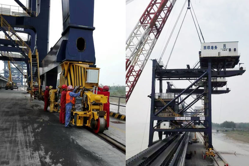 本次兩臺(tái)卸船機(jī)(7#機(jī)、8#機(jī))于2016年9月中旬在張家港制造基地整機(jī)安裝結(jié)束后,于9月17日開始滾裝,并分別于9月19日,9月20日滾裝上船,加固海固件;9月21日具備發(fā)運(yùn)條件并出港; 9月22日晚搭載卸船機(jī)的駁船“匯宗?!卑踩诌_(dá)西壩碼頭;9月24日和25日,卸船機(jī)正式吊裝上岸并順利入軌;吊裝小門架和安裝前大梁,標(biāo)志著本次滾裝、運(yùn)輸、吊裝工程全部順利完成。7#機(jī)、8#機(jī)是華新機(jī)電與南京西壩共同自主研發(fā)的第二套在線料斗稱重卸船機(jī),歷時(shí)半年時(shí)間制造完成,技術(shù)國(guó)際領(lǐng)先,制造工藝先進(jìn),生產(chǎn)工期高效。