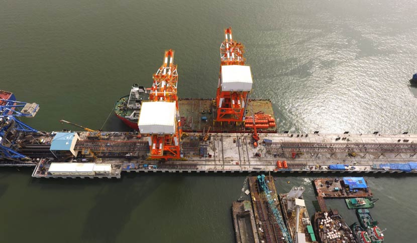 Tanjung Bin電廠在碼頭一期工程建設(shè)時,配置了2臺德國鏈斗卸船機(jī)。2012年,電廠考慮將鏈斗卸船機(jī)更換為抓斗卸船機(jī)。當(dāng)年,華新機(jī)電與Tanjung Bin電廠進(jìn)行了第一次合作,并于2013年提供了1臺2000tph抓斗卸船機(jī),在電廠碼頭采用大件吊裝的方式吊裝上岸并順暢使用。2017年,Tanjung Bin電廠進(jìn)行碼頭二期的工程建設(shè)。電廠向華新機(jī)電再次采購了2臺2400tph抓斗卸船機(jī),要求采用滾裝上岸方式交貨。2018年10月,兩臺2400tph抓斗卸船機(jī)在Tanjung Bin電廠碼頭順利滾裝上岸。