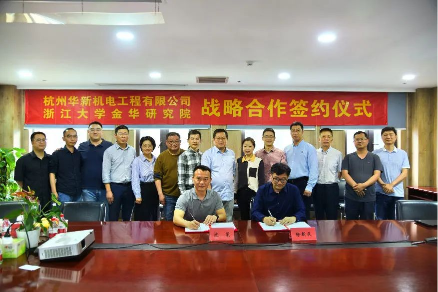在嘉賓們的共同見證下,公司副總經(jīng)理沈策與浙大金華院常務副院長徐新民共同簽署了《杭州華新機電工程有限公司-浙江大學金華研究院戰(zhàn)略合作協(xié)議》。