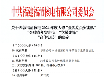 12月18日,福清核電公司黨委發(fā)文表彰了一批2024年度大修“金牌黨員突擊隊(duì)”“金牌青年突擊隊(duì)”“黨員先鋒”“宣傳尖兵”,華新公司福清行車維保項(xiàng)目黨員突擊隊(duì)、起重設(shè)備可靠性保障黨員突擊隊(duì)被評為“金牌黨員突擊隊(duì)”,黨員尹飛虎被評為“大修黨員先鋒”。這是業(yè)主對華新公司以及具體項(xiàng)目團(tuán)隊(duì)的充分肯定。